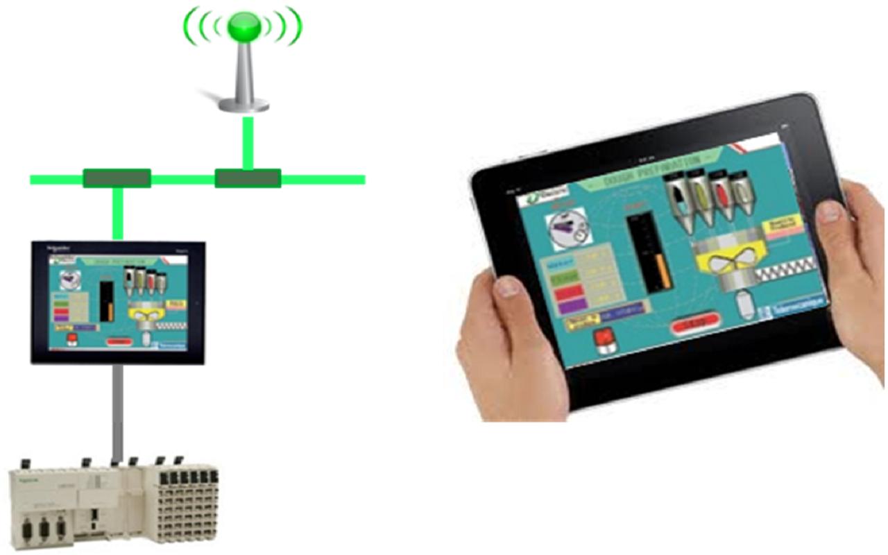 Nesta configuração, o terminal HMI atua como o servidor, enquanto o tablet ou smartphone atua como o cliente. O servidor e o cliente se comunicam sobre redes WiFi, 3G, 4G ou LTE.